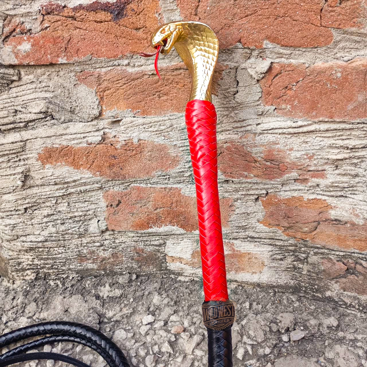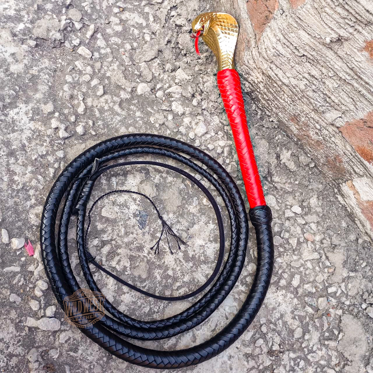 Introducing our Pommeled Golden Snake Head Bullwhip in stunning black and red, designed for enthusiasts and collectors seeking a high-quality whip. This Australian style professional bullwhip combines premium craftsmanship with exceptional performance, making it perfect for both practice and display.
